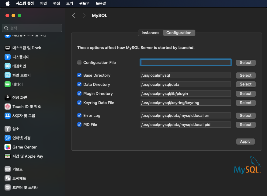 세션 단위가 아닌 영구적인 제거를 하고 싶다. 이와 관련한 자료를 쉽게 찾을 수 있지만 내가 적용할 수 있는 사례를 찾을 수 없었다. my.cnf를 찾아서 수정하는 작업이 필요한데 자료에서 나오는 위치에 my.cnf를 찾을 수 없었다. 또한 자료에는 Homebrew를 통해 MySQL을 설치한 케이스가 많았지만 난 직접 MySQL을 다운로드받고 설치한 케이스여서 도움을 받을 수 없었다. 그 와중에 시스템설정에서 Configuration File을 선택하는 부분을 볼 수 있었다. 여기서 힌트를 얻었다.