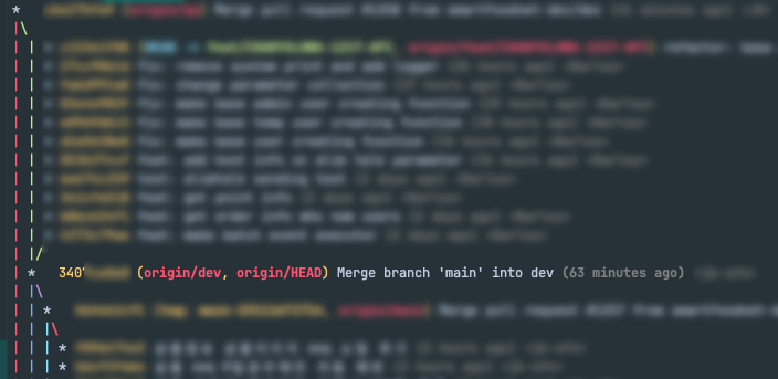 git logg를 입력하면 아래와 같은 형태가 나타난다. 일부 블러처리하여 내용은 볼 수 없겠지만 커밋 ID와 현재 브랜치 위치, 커밋 로그, 커밋한 유저, 커밋 날짜 등을 알 수 있다.